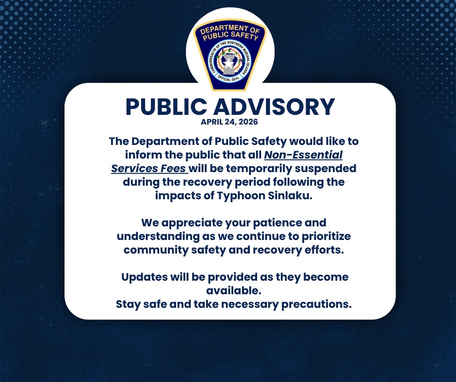 SAIPAN — The Department of Public Safety announced Friday that all non-essential services fees will be temporarily suspended during the recovery period following Typhoon Sinlaku.