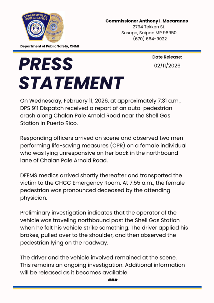 SAIPAN — The Department of Public Safety released an official statement Wednesday evening at 6:51pm, outlining initial investigative details in the Puerto Rico auto-pedestrian crash that left a female pedestrian dead.