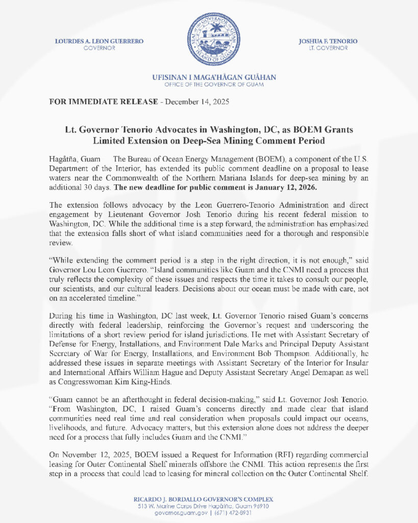 SAIPAN — The U.S. Bureau of Ocean Energy Management (BOEM) has extended the public comment deadline on a proposal to lease waters near the Commonwealth of the Northern Mariana Islands for deep-sea mining by an additional 30 days, setting a new deadline of Jan. 12, 2026.