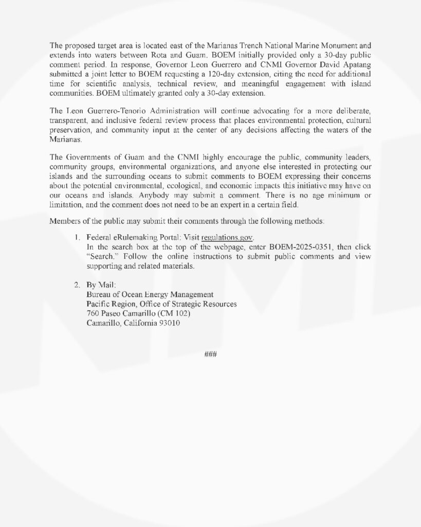 BOEM initially provided a 30-day public comment period and that Governor Leon Guerrero and CNMI Governor David Apatang later submitted a joint request for a 120-day extension, citing the need for scientific analysis, technical review, and meaningful community engagement. BOEM ultimately granted only a 30-day extension.