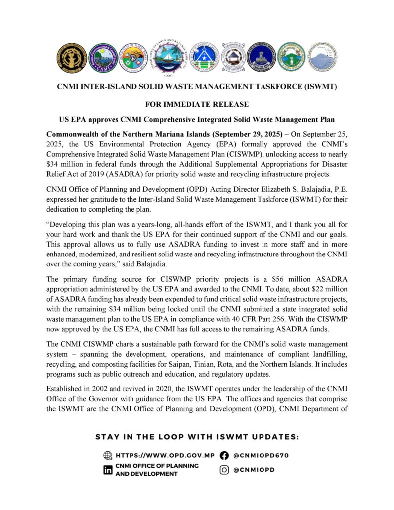 SAIPAN – The U.S. Environmental Protection Agency has approved the CNMI’s Comprehensive Integrated Solid Waste Management Plan, giving the Commonwealth full access to nearly $34 million in federal funding for solid waste and recycling infrastructure.