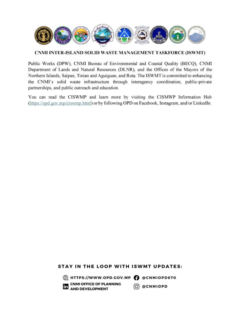 The ISWMT includes OPD, the Department of Public Works, Bureau of Environmental and Coastal Quality, Department of Lands and Natural Resources, and the mayoral offices of Saipan, Tinian and Aguiguan, Rota, and the Northern Islands. The taskforce said it will continue to drive improvements through interagency coordination, public-private partnerships, and community outreach.