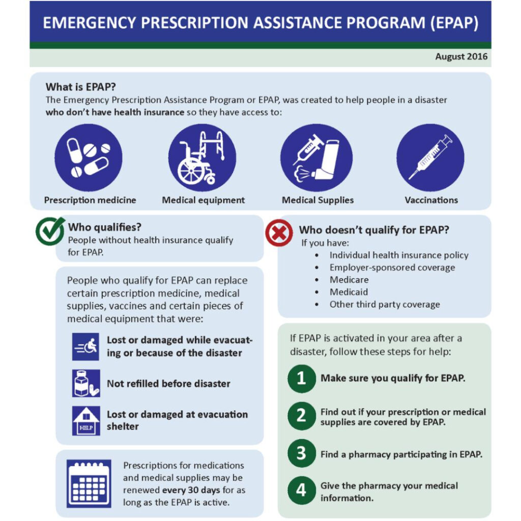 Eligible residents can use EPAP to replace prescription medications, medical supplies, vaccines and certain medical equipment that were lost or damaged during the typhoon, were not refilled before the storm, or were lost or damaged at an evacuation shelter. Prescriptions and medical supplies may be renewed every 30 days for as long as EPAP remains active.