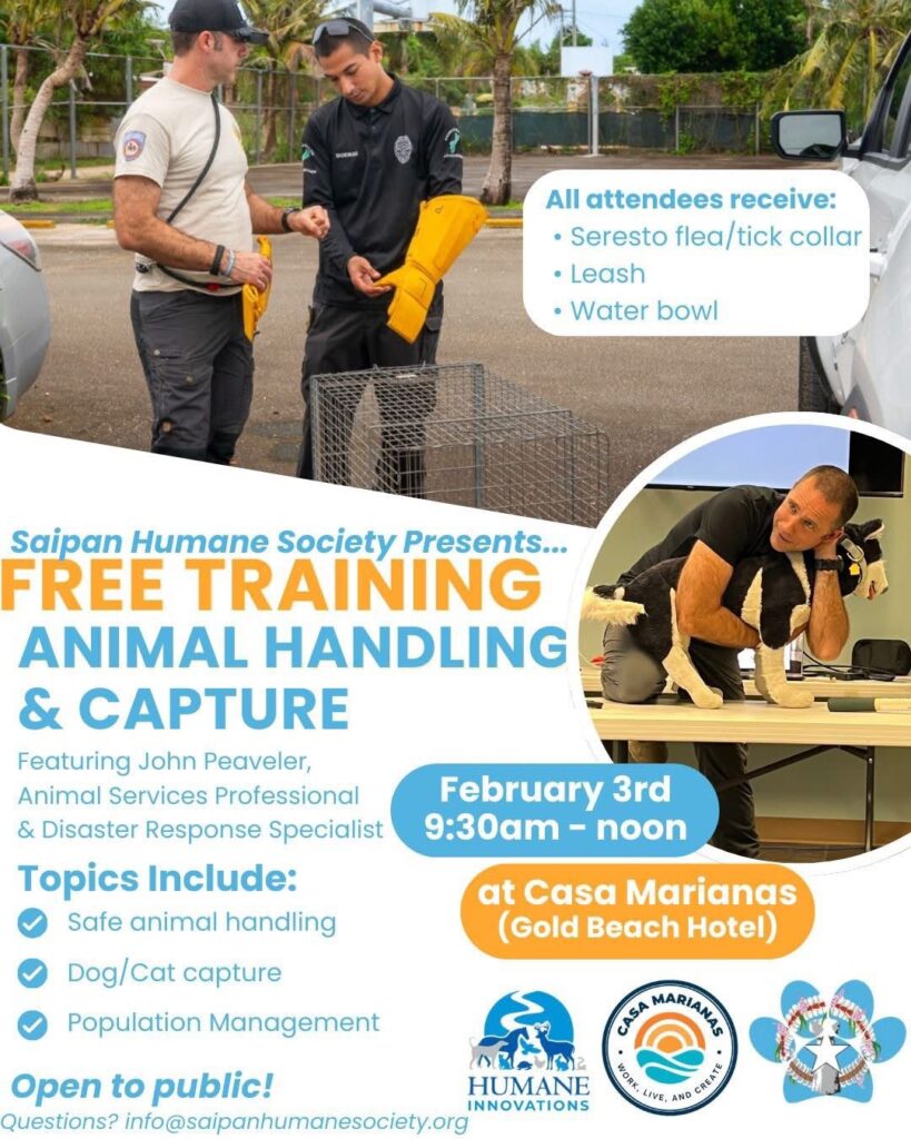 SAIPAN — The Saipan Humane Society is inviting the public to a free training focused on animal handling and capture on Tuesday, February 3 from 9:30 a.m. to noon, at Casa Marianas (Gold Beach Hotel).