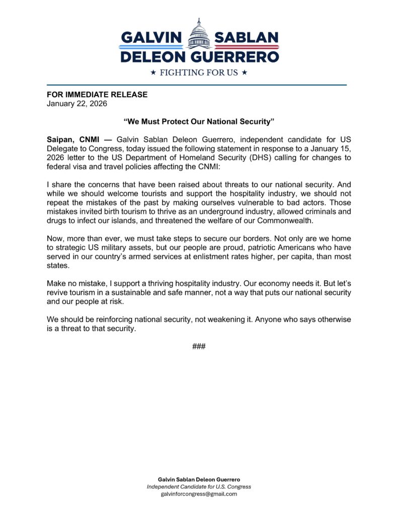 SAIPAN — Congressional candidate Galvin Deleon Guerrero weighed in this week on the growing debate over the CNMI’s visa waiver framework, saying he shares concerns about national security threats and warning the Commonwealth should avoid policies that “make ourselves vulnerable to bad actors.”