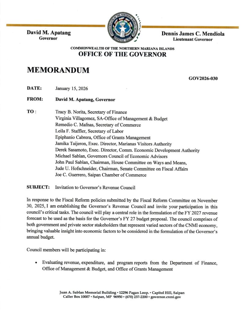 SAIPAN — Governor David M. Apatang is establishing a Governor’s Revenue Council to help develop the FY 2027 revenue forecast that will serve as the basis for the administration’s FY 2027 budget proposal, and has invited a group of government and private-sector stakeholders to participate.