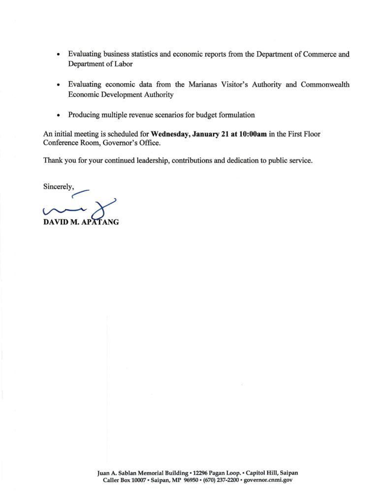 In a memorandum released this afternoon, Apatang invited participation from senior officials and key stakeholders including Finance Secretary Tracy B. Norita, OMB’s Virginia Villagomez, Commerce Secretary Remedio C. Mafnas, Labor Secretary Leila F. Staffler, Office of Grants Management’s Epiphanio Cabrera, MVA Executive Director Jamika Taijeron, CEDA Executive Director Derek Sasamoto, Michael Sablan of the Governor’s Council of Economic Advisors, House Ways and Means Chairman John Paul Sablan, Senate Fiscal Affairs Chairman Jude U. Hofschneider, and Saipan Chamber of Commerce President Joe C. Guerrero.