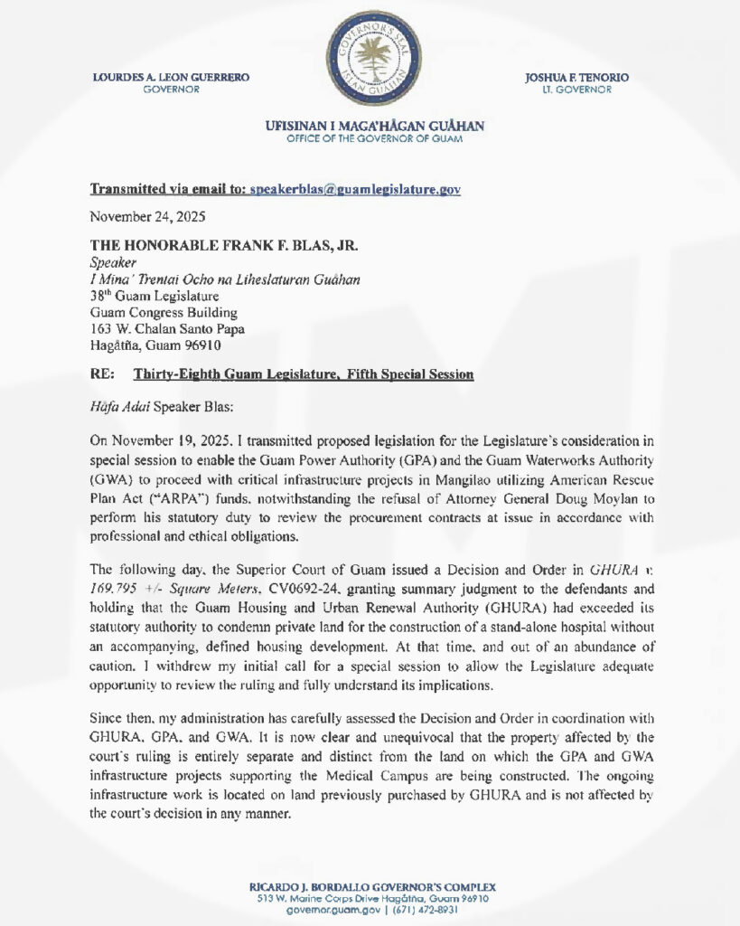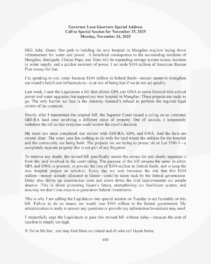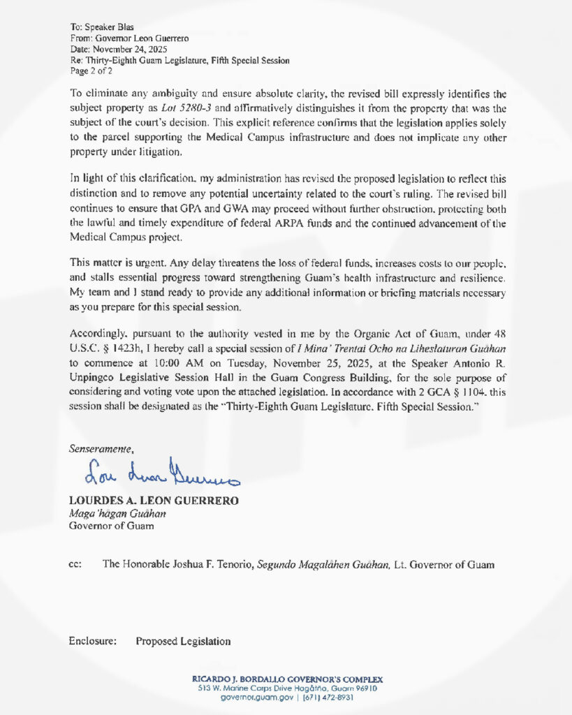 Leon Guerrero’s letter explains that she initially called for a special session on similar legislation earlier this month but withdrew it after the Superior Court of Guam issued a ruling in a separate GHURA land case. She said her administration then reviewed the decision with GHURA, GPA and GWA and concluded that the property in the court case is “entirely separate and distinct” from the land where the medical campus utilities are being built.