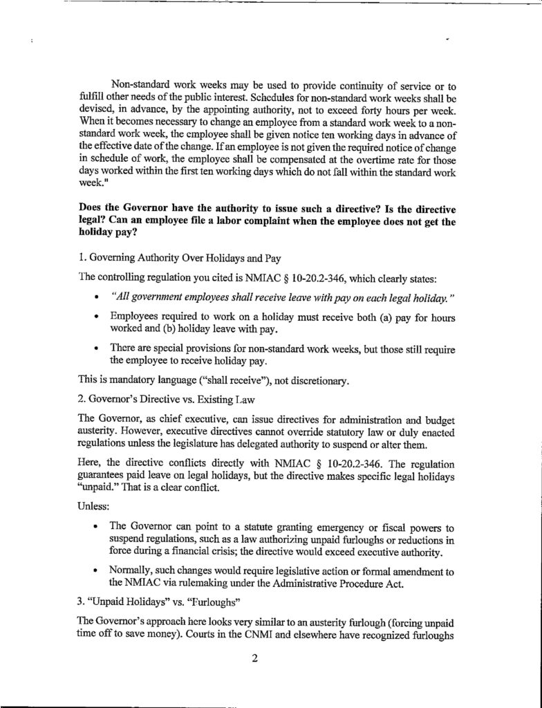 The opinion, prepared by Senate Legislative Counsel Jose A. Bermudes, examined Directive 2026-008, which lists seven holidays between October 2025 and July 2026 as “unpaid.” The memorandum points to the Northern Mariana Islands Administrative Code § 10-20.2-346, which mandates that “all government employees shall receive leave with pay on each legal holiday.”