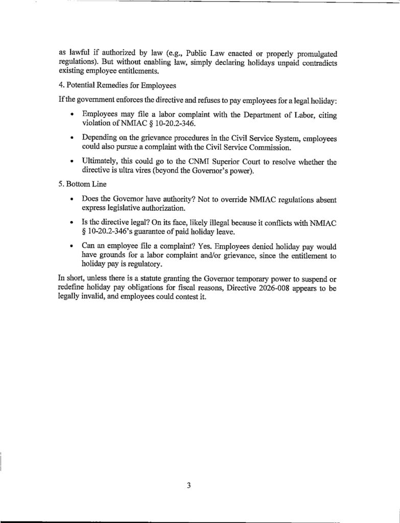 If the directive is enforced, employees could file labor complaints with the Department of Labor or pursue grievances through the Civil Service Commission. The matter could also reach the CNMI Superior Court to determine whether the order is beyond the governor’s power.