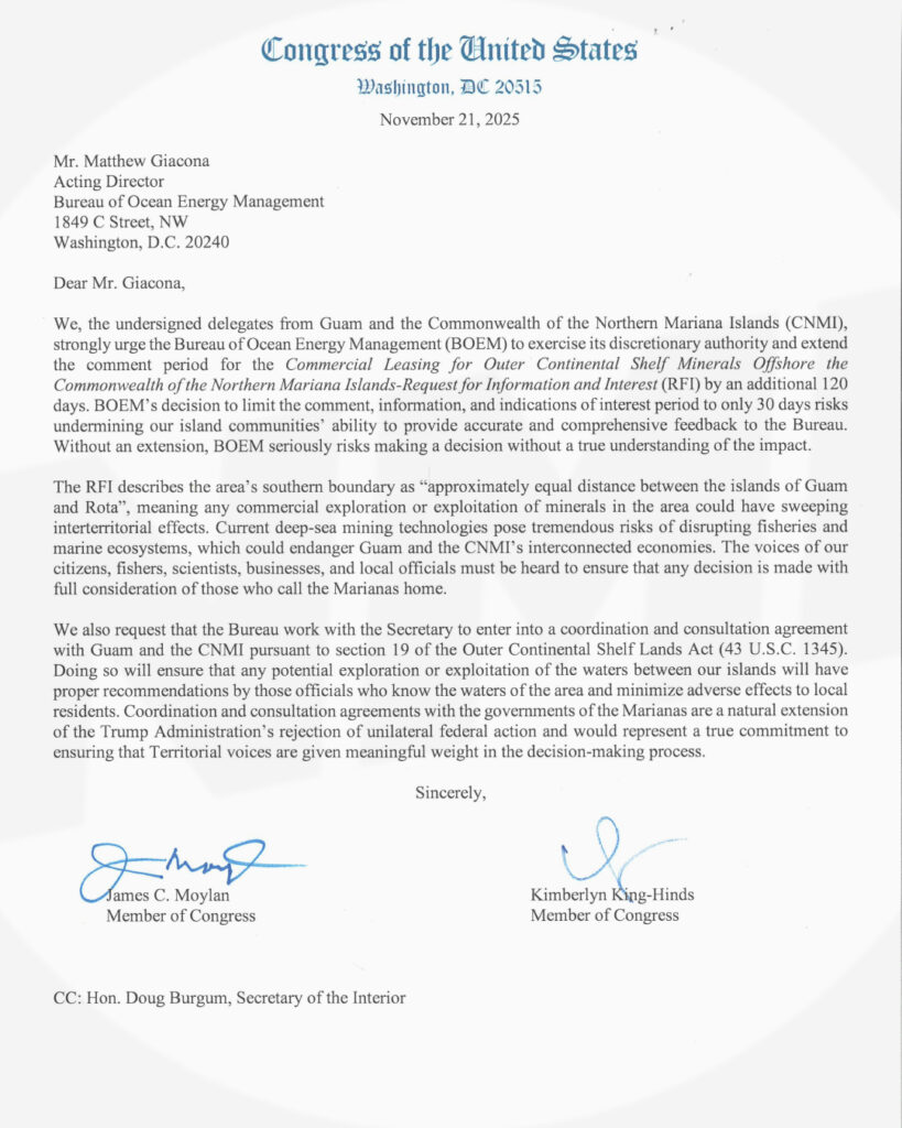 In a November 21 letter to Acting BOEM Director Matthew Giacona, the delegates urged the agency to use its discretion to extend the comment period for the Commercial Leasing for Outer Continental Shelf Minerals Offshore the Commonwealth of the Northern Mariana Islands – Request for Information and Interest by an additional 120 days. They said BOEM’s decision to allow only 30 days for comments, information, and indications of interest risks undermining the ability of Guam and CNMI communities to provide accurate and comprehensive feedback.
