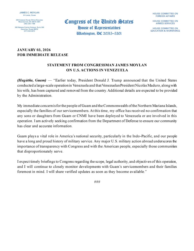 HAGÅTÑA, Guam — Guam’s congressional delegate is awaiting detailed briefings from the Pentagon following President Donald Trump’s announcement of a large-scale U.S. military operation in Venezuela that resulted in the capture of President Nicolás Maduro.