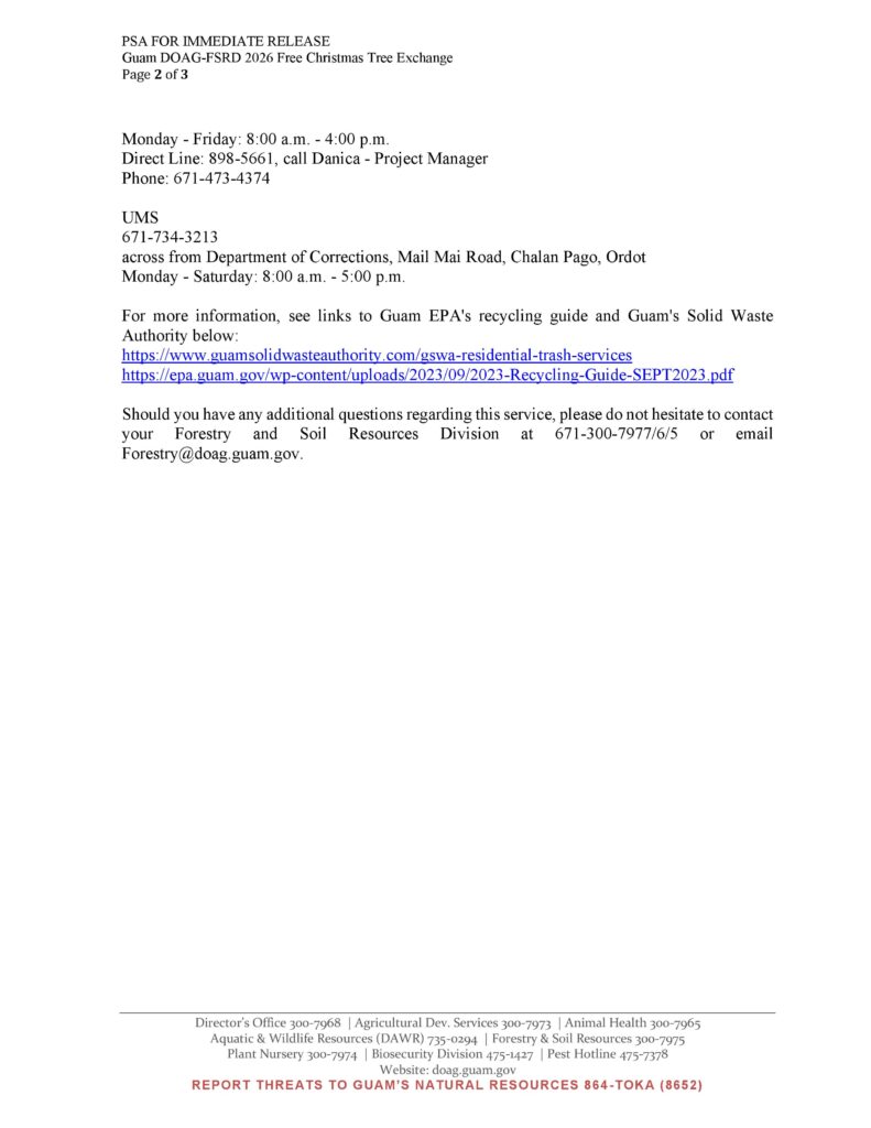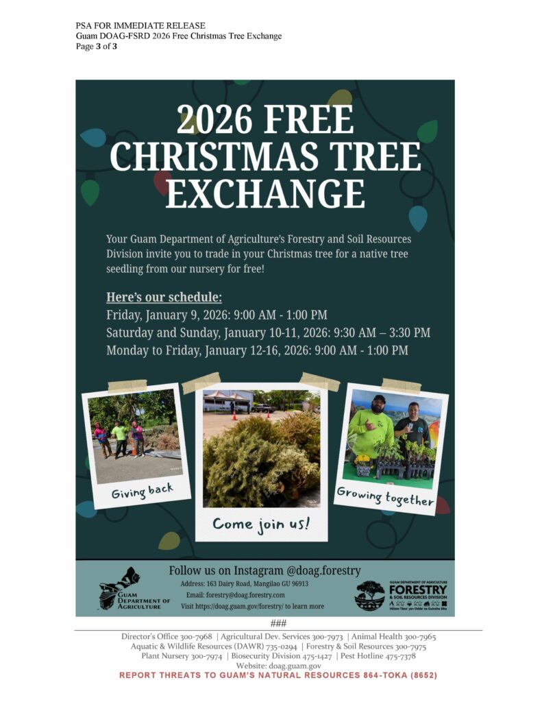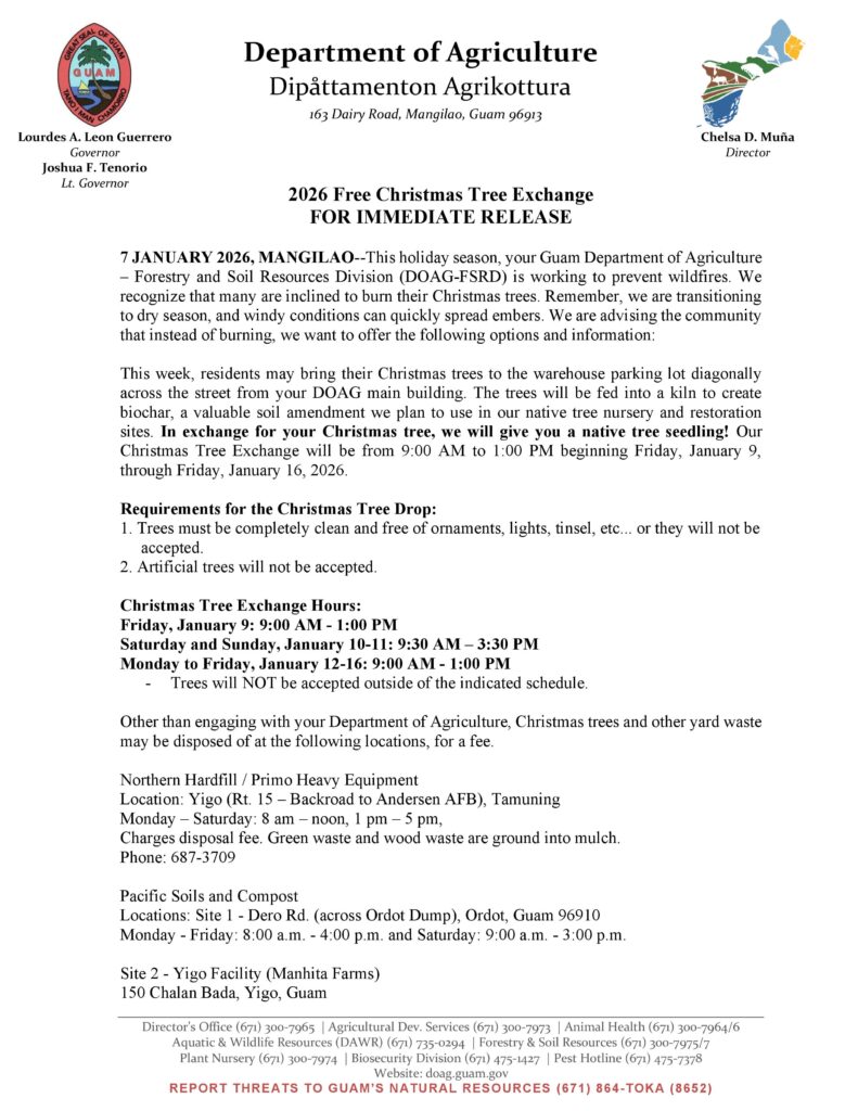 MANGILAO, Guam — As Guam heads into the drier season, the Guam Department of Agriculture’s Forestry and Soil Resources Division is asking residents not to burn Christmas trees and is offering a free alternative aimed at reducing wildfire risk.