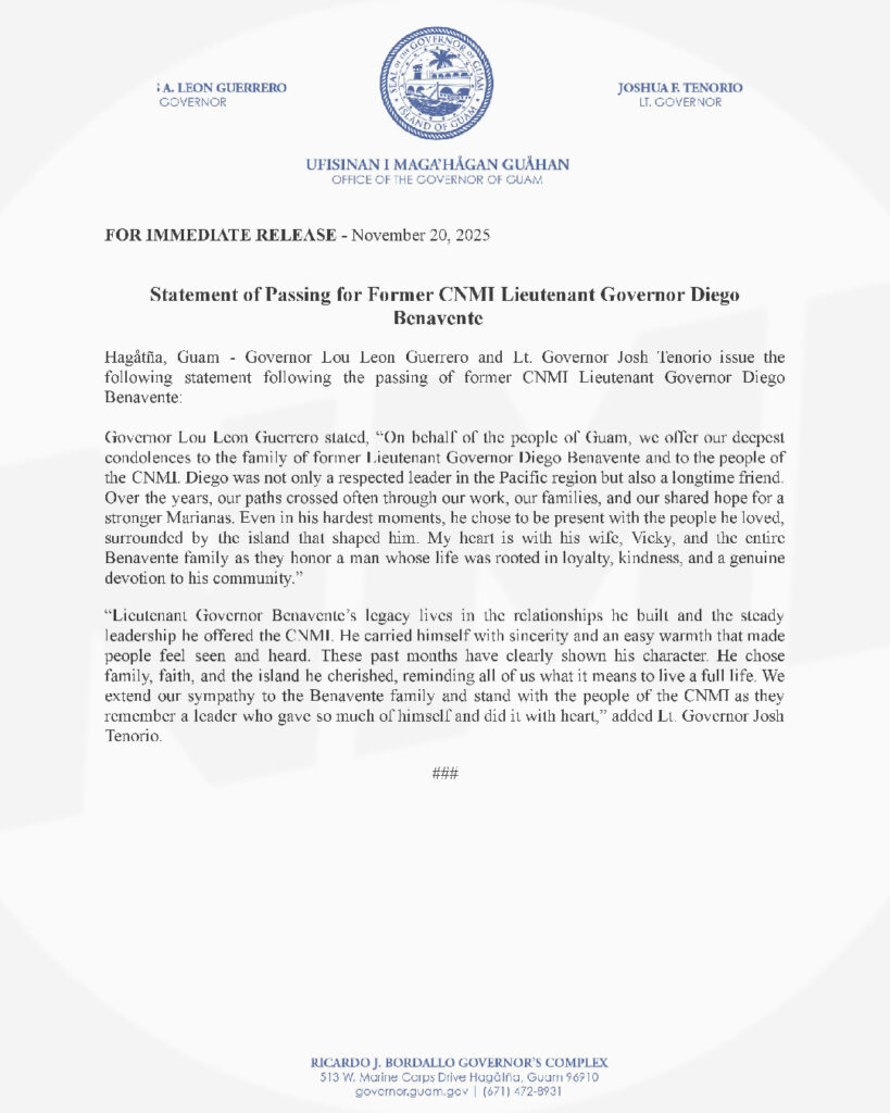 In a statement issued Thursday, Leon Guerrero said that on behalf of the people of Guam, she offers “our deepest condolences to the family of former Lieutenant Governor Diego Benavente and to the people of the CNMI,” noting that their paths crossed often through work, family, and a shared hope for a stronger Marianas. She said even in his hardest moments, Benavente chose to be present with the people he loved, “surrounded by the island that shaped him.”