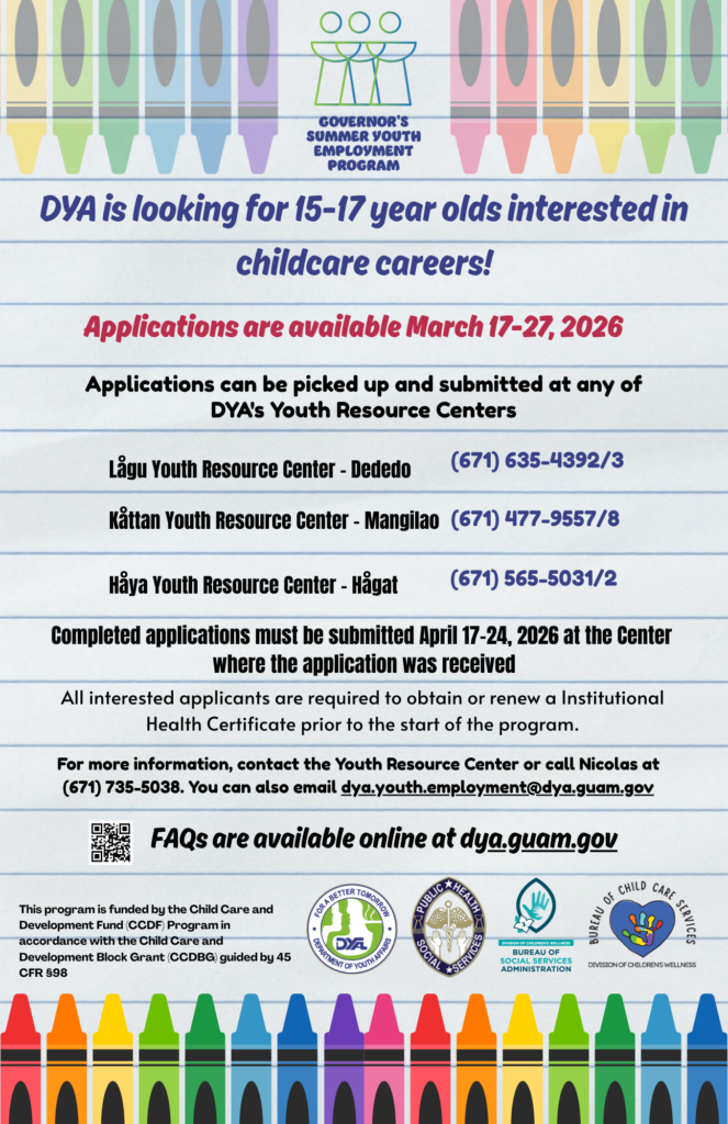 HAGATNA — The Guam Department of Youth Affairs will begin accepting applications March 17 for the childcare component of the Governor’s Summer Youth Employment Program, offering teens ages 15 to 17 the chance to work in daycare centers and summer camps this summer.