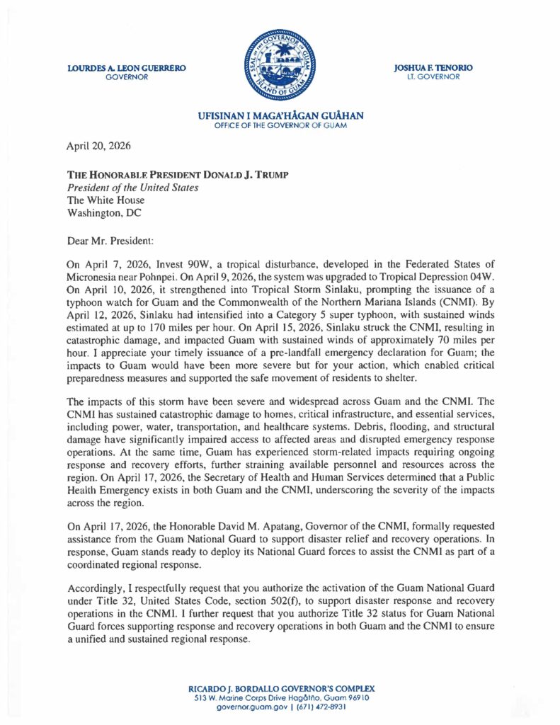 HAGÅTÑA, Guam — Governor Lourdes A. Leon Guerrero formally asked President Donald J. Trump on Monday to authorize the activation of the Guam National Guard under federal Title 32 status to support Typhoon Sinlaku disaster recovery operations across Guam and the Commonwealth of the Northern Mariana Islands.