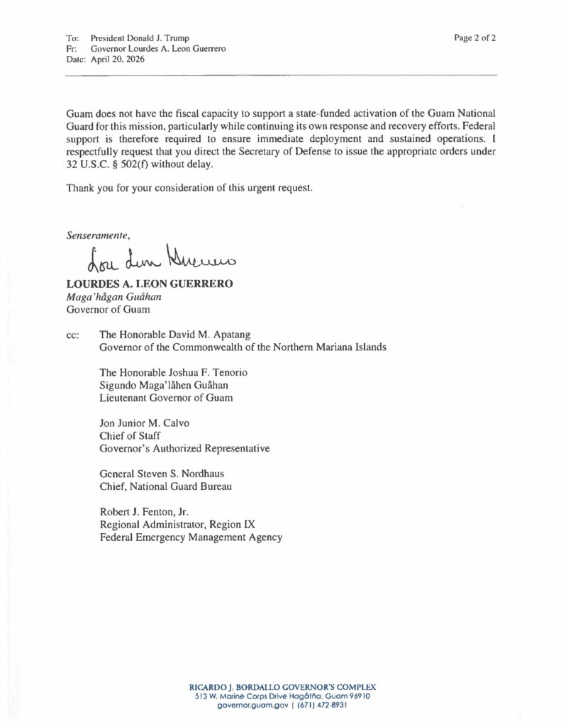 Leon Guerrero also noted that CNMI Governor David M. Apatang formally requested Guam National Guard assistance on April 17, and that Guam stands ready to deploy once federal authorization is granted.
