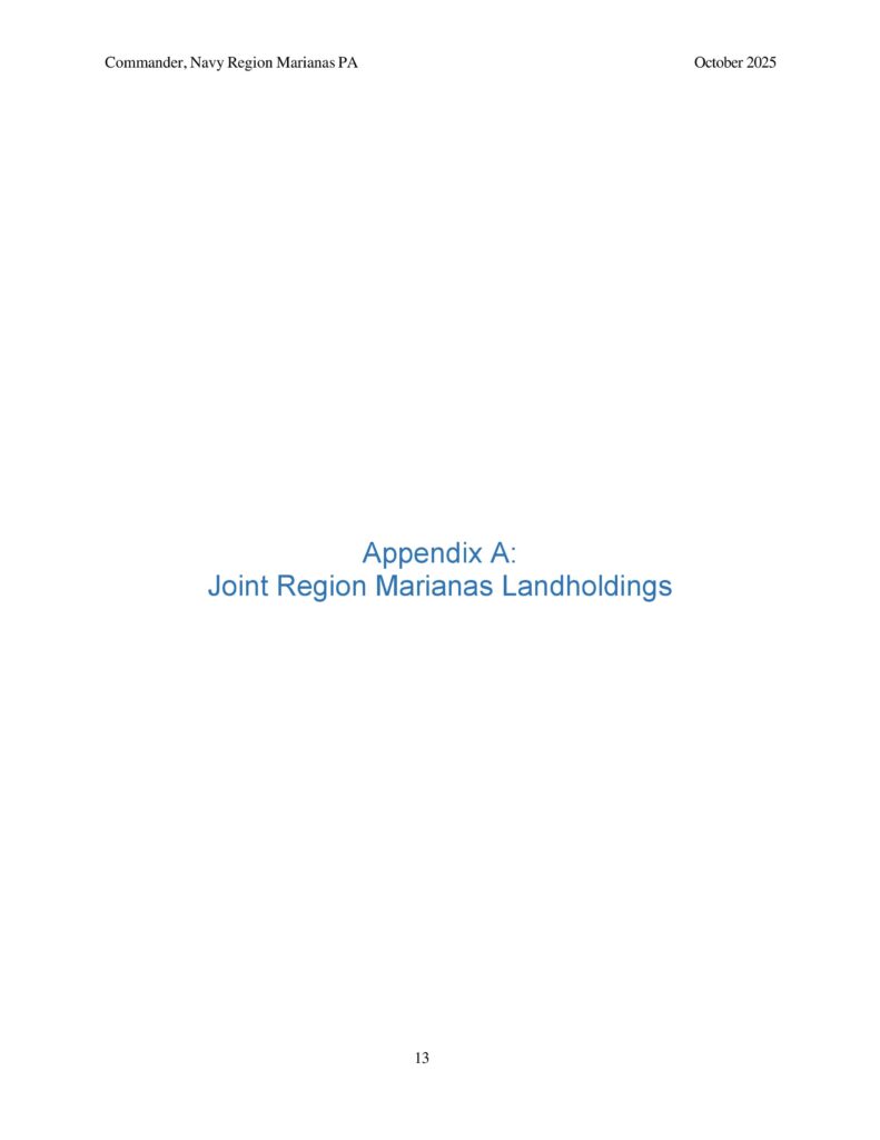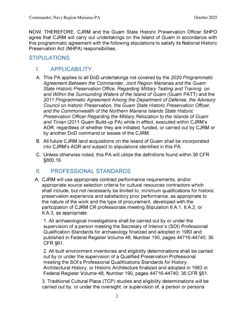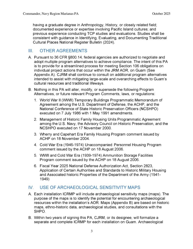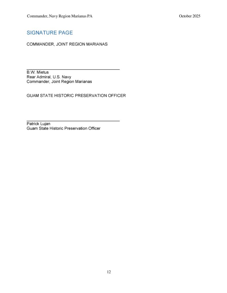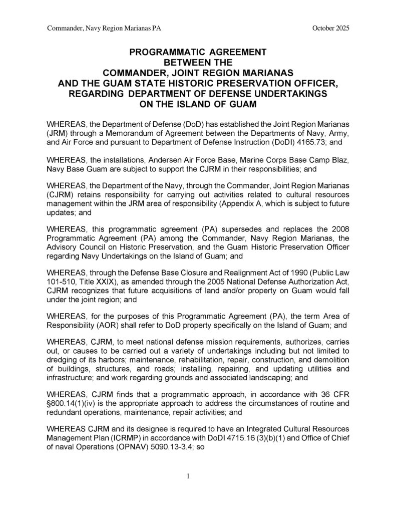 According to the governor’s office, the draft Programmatic Agreement would apply to DoD undertakings on Guam within Joint Region Marianas’ area of responsibility not already covered by existing agreements, including the 2011 Guam Buildup Programmatic Agreement and the 2020 testing and training Programmatic Agreement. It would also replace and supersede a 2008 agreement for Navy undertakings on Guam.