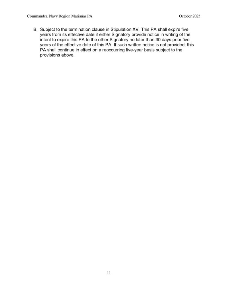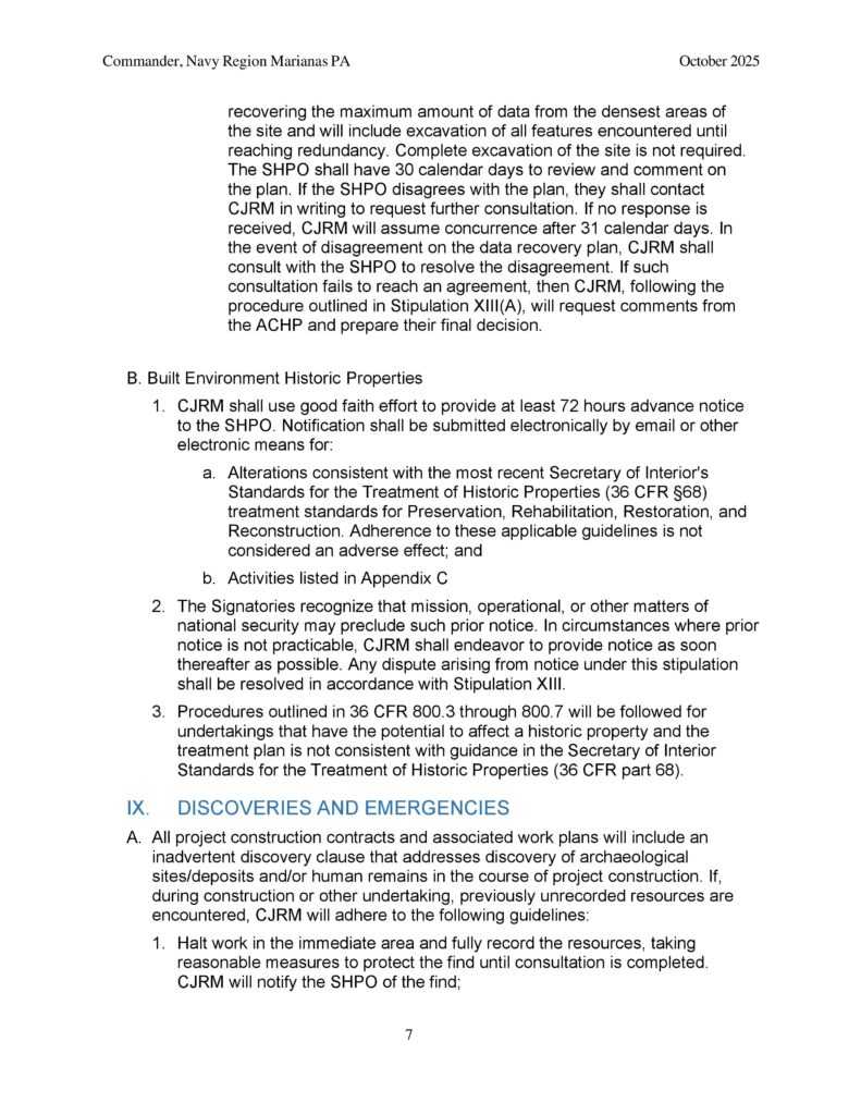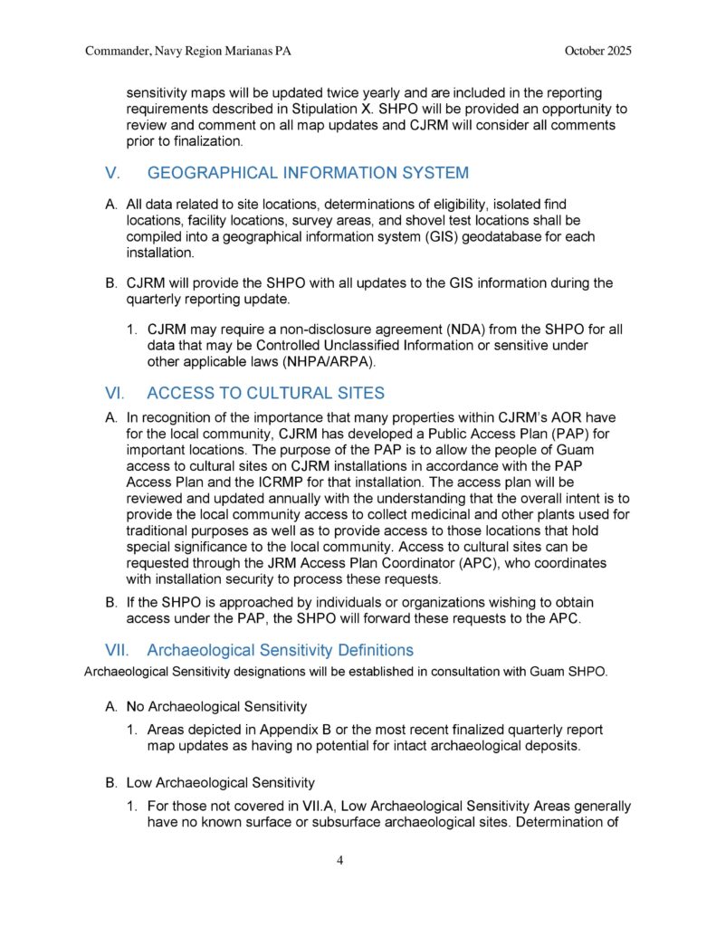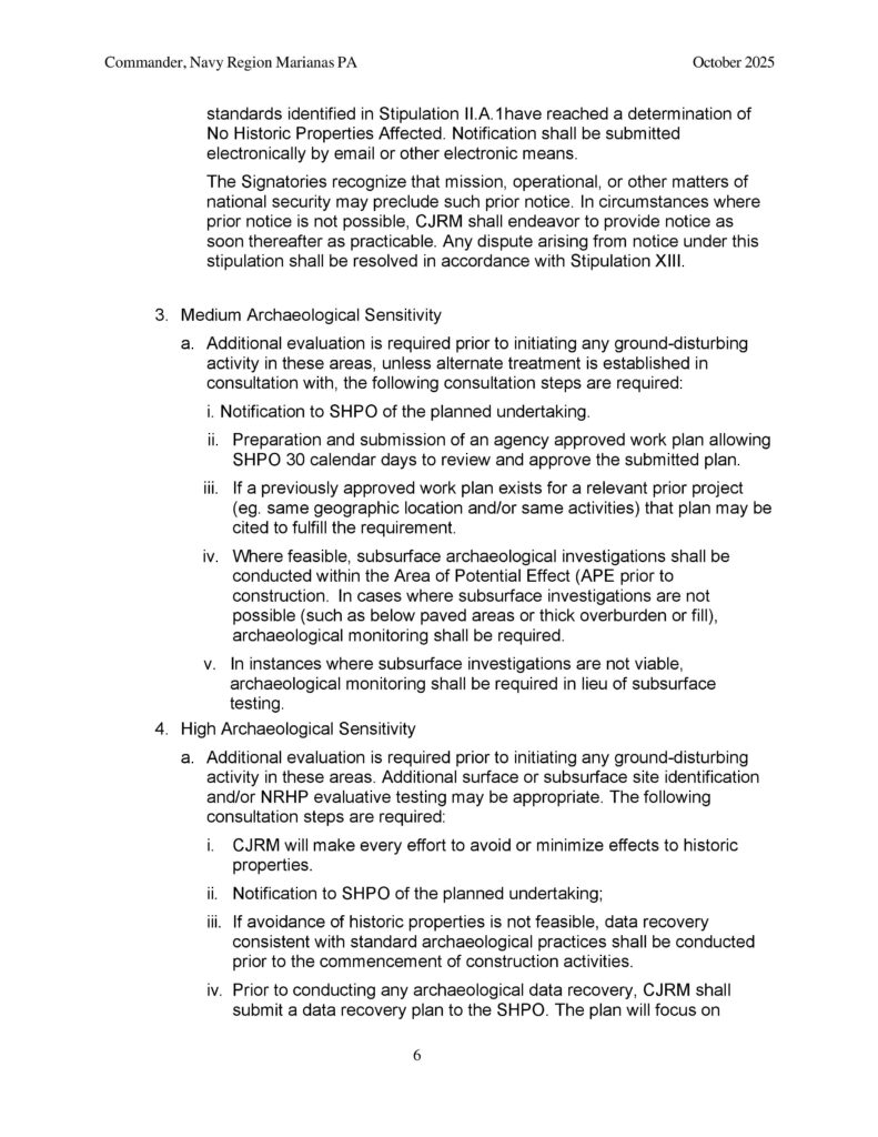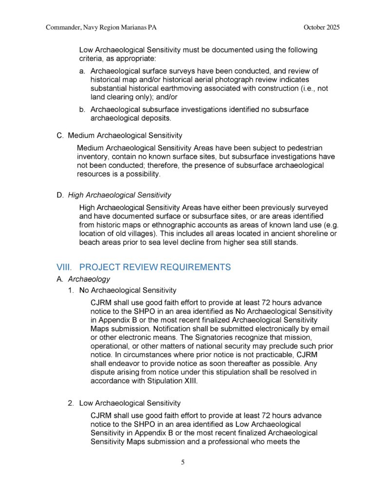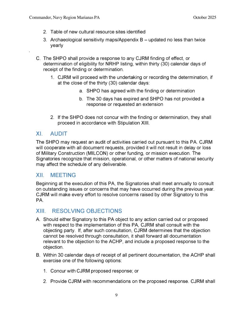 According to the governor’s office, the draft Programmatic Agreement would apply to DoD undertakings on Guam within Joint Region Marianas’ area of responsibility not already covered by existing agreements, including the 2011 Guam Buildup Programmatic Agreement and the 2020 testing and training Programmatic Agreement. It would also replace and supersede a 2008 agreement for Navy undertakings on Guam.