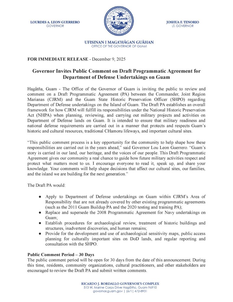 In announcing the public comment period, Gov. Lourdes A. Leon Guerrero encouraged community members to read the draft and submit input, saying the process gives residents a chance to help shape how future military activities will respect and protect cultural sites and heritage.