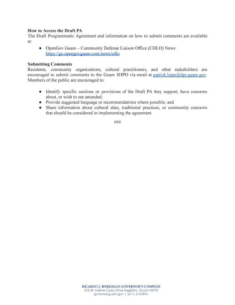The public comment period will be open for 30 days from the date of the announcement. The draft agreement and instructions for submitting comments are posted on OpenGov Guam under the Community Defense Liaison Office news page, and written comments may be submitted to the Guam SHPO by email.