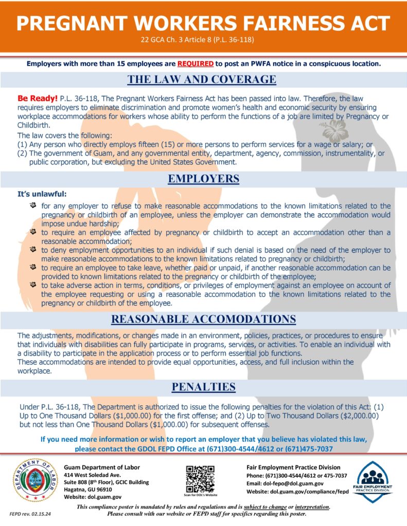 Hagåtña, Guam — The Guam Department of Labor is reminding employers that new signage tied to the Pregnant Workers Fairness Act must be posted in workplaces within 90 days now that the law’s rules and regulations have been signed into public law.
