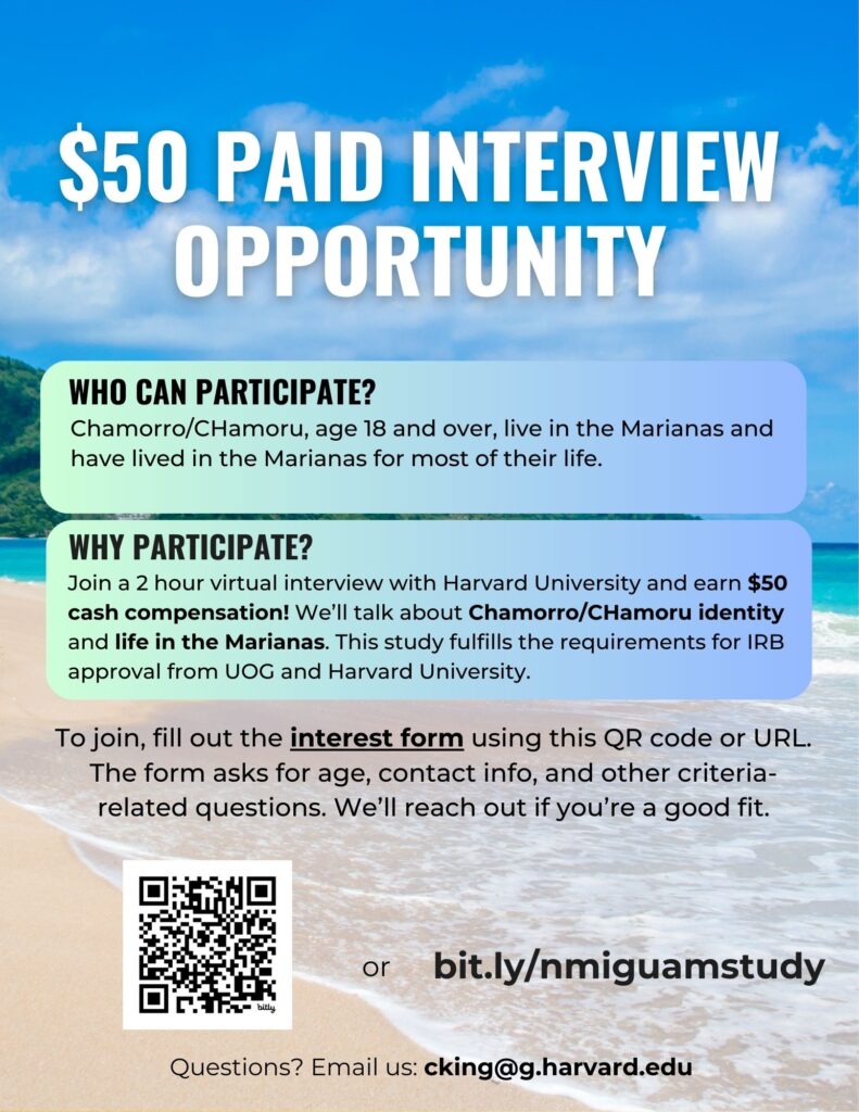 The study is seeking Chamorro and Carolinian participants who are 18 and older, currently live in the Marianas, and have lived in the Marianas for most of their life. Participants who complete the interview will receive $50 cash compensation. The study has Institutional Review Board (IRB) approval through the University of Guam and Harvard University.