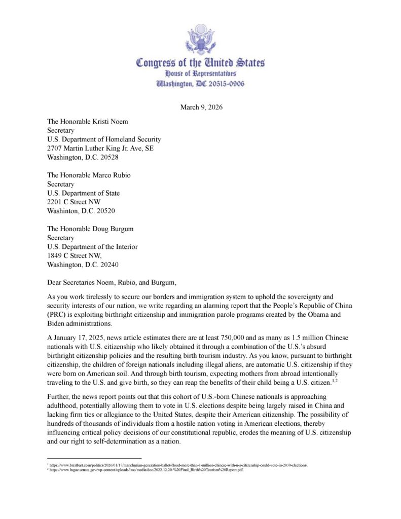 The letter’s primary sourcing for its central claim, that between 750,000 and 1.5 million Chinese nationals hold U.S. citizenship obtained through birth tourism, is a January 2025 article from Breitbart News.