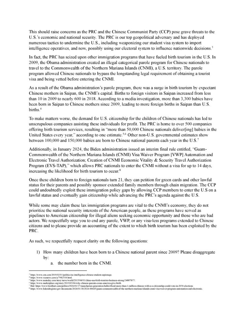 The letter claims a 2009 Obama administration parole program allowed Chinese nationals to bypass the standard visa process to enter the CNMI, resulting in a surge in births to Chinese mothers in Saipan, from fewer than 10 in 2009 to nearly 600 in 2018. It also targets the CNMI Economic Vitality and Security Travel Authorization Program, known as EVS-TAP, describing it as a Biden administration creation that increases the likelihood of birth tourism by allowing Chinese nationals to enter the CNMI for up to 14 days without a visa.