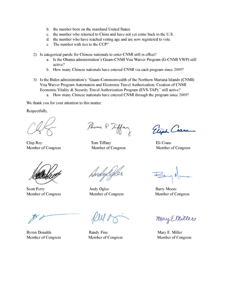 The letter, led by Representatives Chip Roy of Texas and Tom Tiffany of Wisconsin, asks Secretaries Kristi Noem, Marco Rubio and Doug Burgum to end “any parole, VWP, or any visa-less programs extended to Chinese citizens” and provide a full accounting of birth tourism activity in the CNMI since 2009.