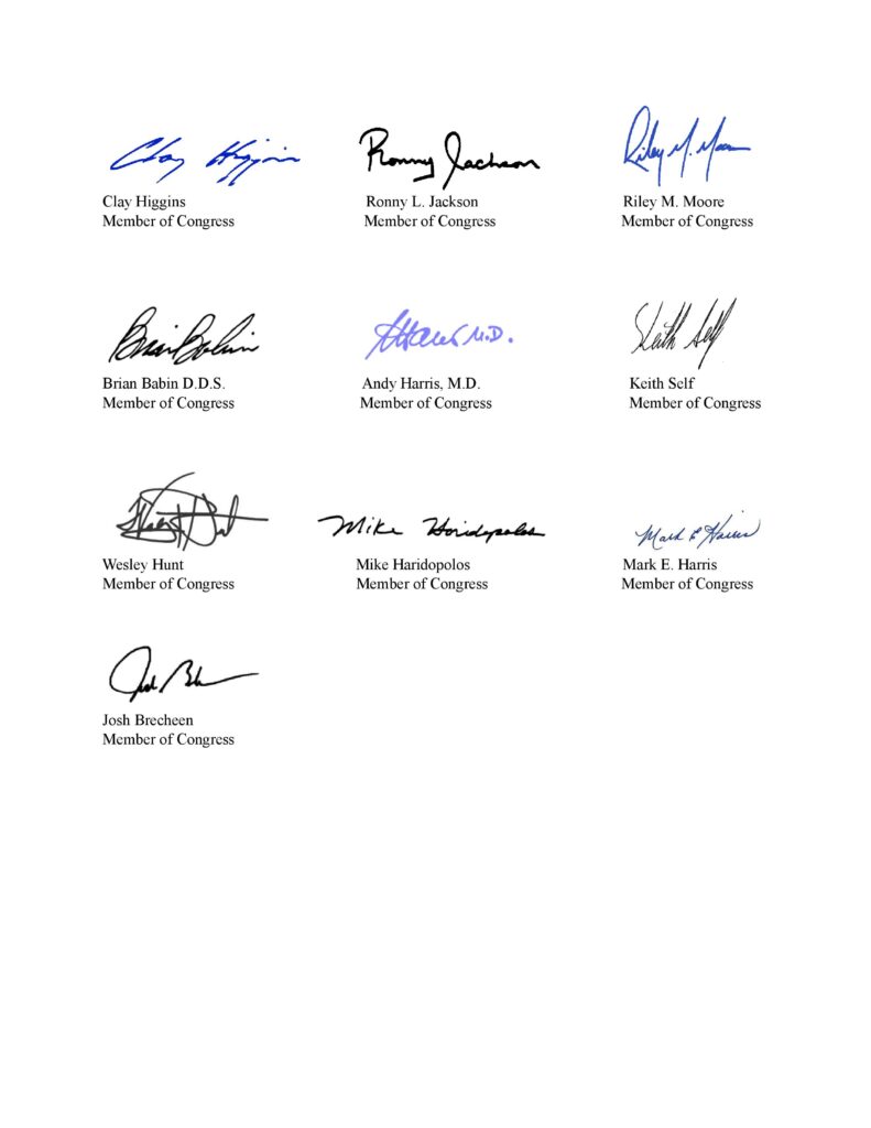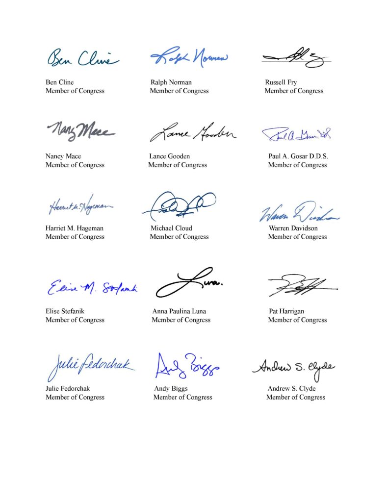 The signatories include Reps. Eli Crane, Scott Perry, Andy Ogles, Barry Moore, Byron Donalds, Randy Fine, Mary E. Miller, Nancy Mace, Elise Stefanik, Anna Paulina Luna, Ronny L. Jackson and 22 others.