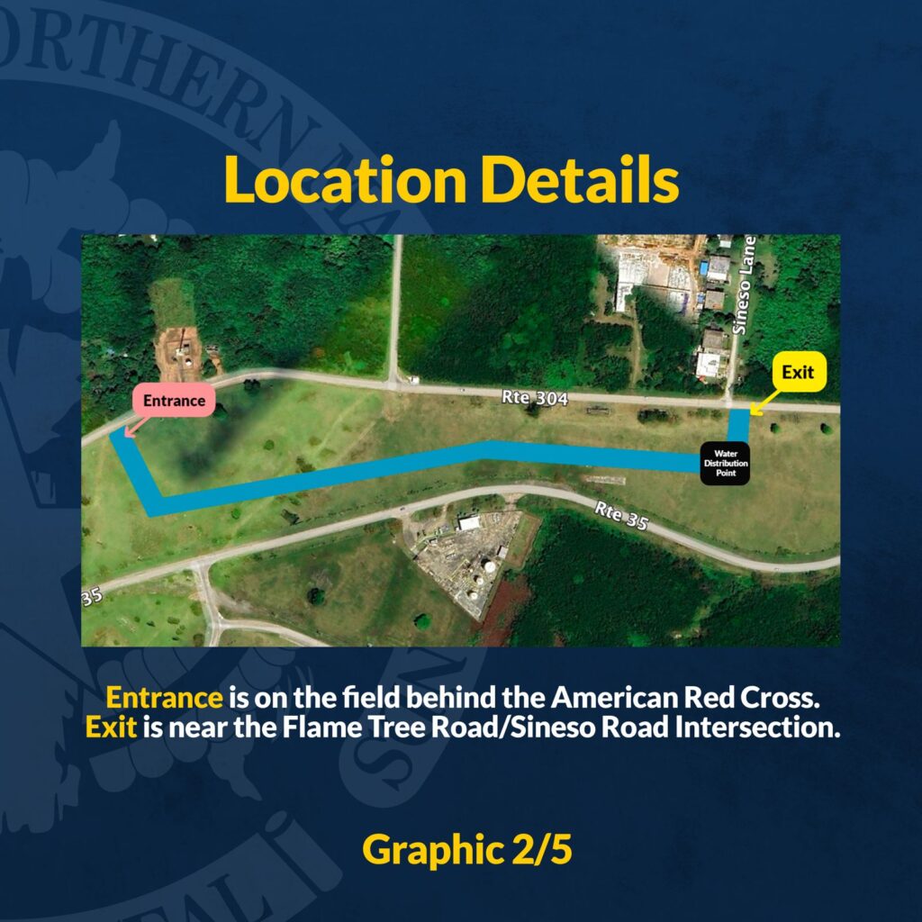 Residents can access the site on foot or by vehicle. Those arriving on foot should use designated pedestrian lanes to avoid vehicle traffic. All vehicles must remain in line. The entrance is on the field behind the American Red Cross. The exit is near the Flame Tree Road and Sineso Road intersection.
