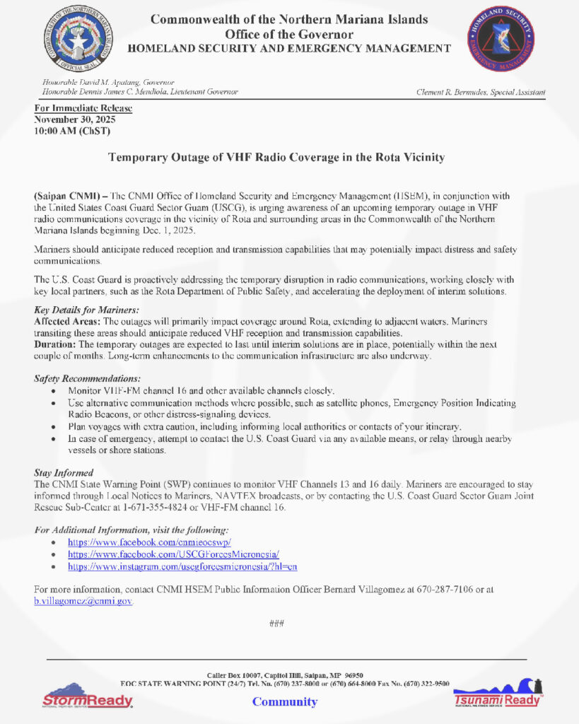 SAIPAN — The CNMI Office of Homeland Security and Emergency Management, working with the U.S. Coast Guard Sector Guam, is urging mariners to prepare for a temporary outage in VHF radio communications coverage in the vicinity of Rota and surrounding waters beginning Dec. 1, 2025.