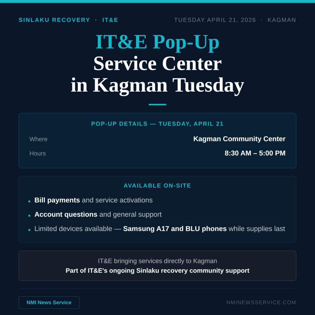 SAIPAN — IT&E will set up a pop-up service center at the Kagman Community Center on Tuesday, April 21, bringing phone services directly to one of the communities hardest hit by road damage from Typhoon Sinlaku.