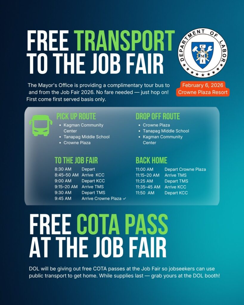 SAIPAN, CNMI — The CNMI Department of Labor’s Job Fair set for Feb. 6 from 9 a.m. to 3 p.m. at Crowne Plaza Resort is now adding a major boost for jobseekers: free bus transportation to the venue, plus free COTA passes while supplies last.