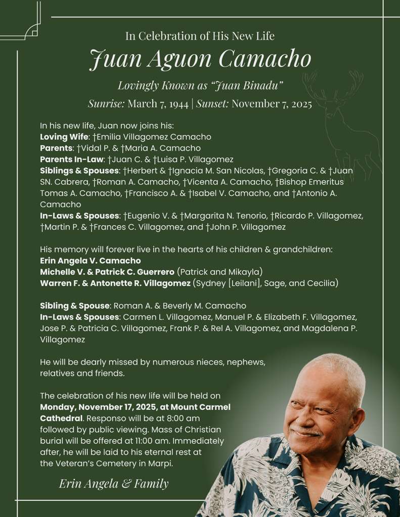 With heavy hearts, the family of Juan Aguon Camacho, better known to many as “Juan Binadu,” announces his passing on November 7, 2025, at the age of 81. Born on March 7, 1944.