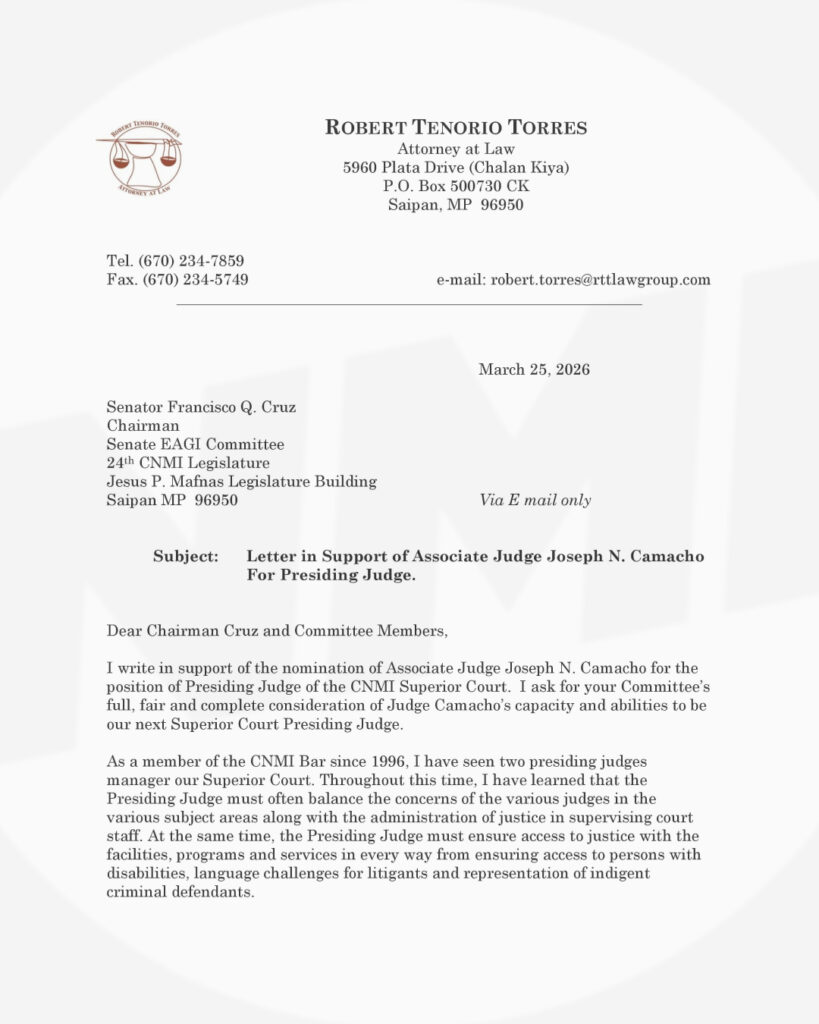 SAIPAN — A Saipan attorney with nearly three decades of practice before the CNMI Superior Court has written to the Senate EAGI Committee in support of Associate Judge Joseph N. Camacho’s nomination for Presiding Judge, while sharply criticizing Attorney General Edward Manibusan’s decision to oppose the nomination.