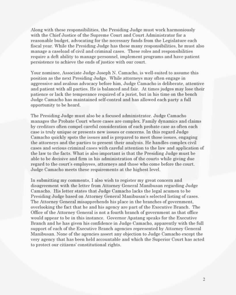 “It was the judiciary and Judge Camacho who spoke to that abuse of power without fear and with absolute clarity,” Torres wrote. “And now the Attorney General comes forward on Judge Camacho’s nomination, when the Court is unable to respond in a public forum, to criticize, denigrate and oppose his nomination because of the thin skin of that office.” Torres called on the committee to confirm Camacho promptly, noting that Governor Apatang has expressed confidence in the nominee and that no executive branch agency represented by the attorney general has filed an objection except the attorney general’s office itself.