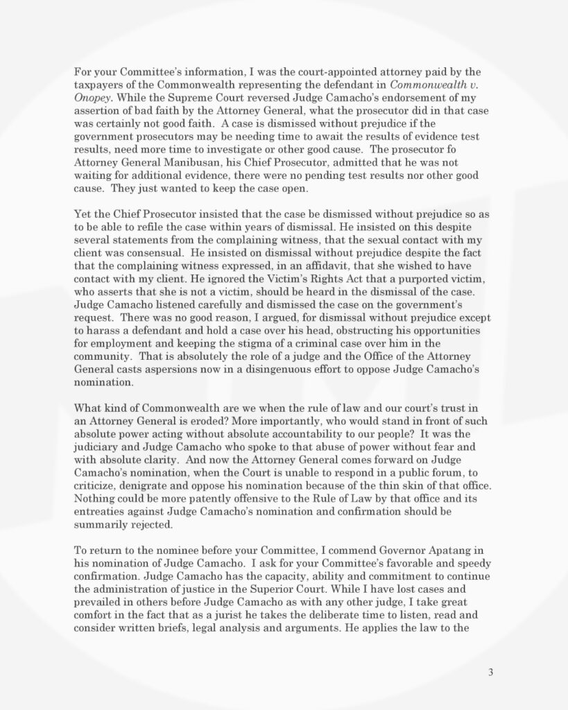 Torres also directed pointed criticism at Manibusan, whose letter to the committee argued that Judge Camacho lacks the legal acumen for the role, citing a selection of cases. Torres called the attorney general’s opposition an overreach.