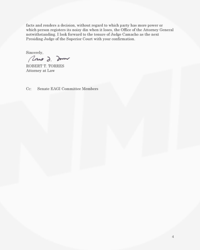 Robert T. Torres, a member of the CNMI Bar since 1996, submitted his letter March 25 to Senate EAGI Committee Chairman Francisco Q. Cruz ahead of the committee’s consideration of the nomination by Governor David M. Apatang.