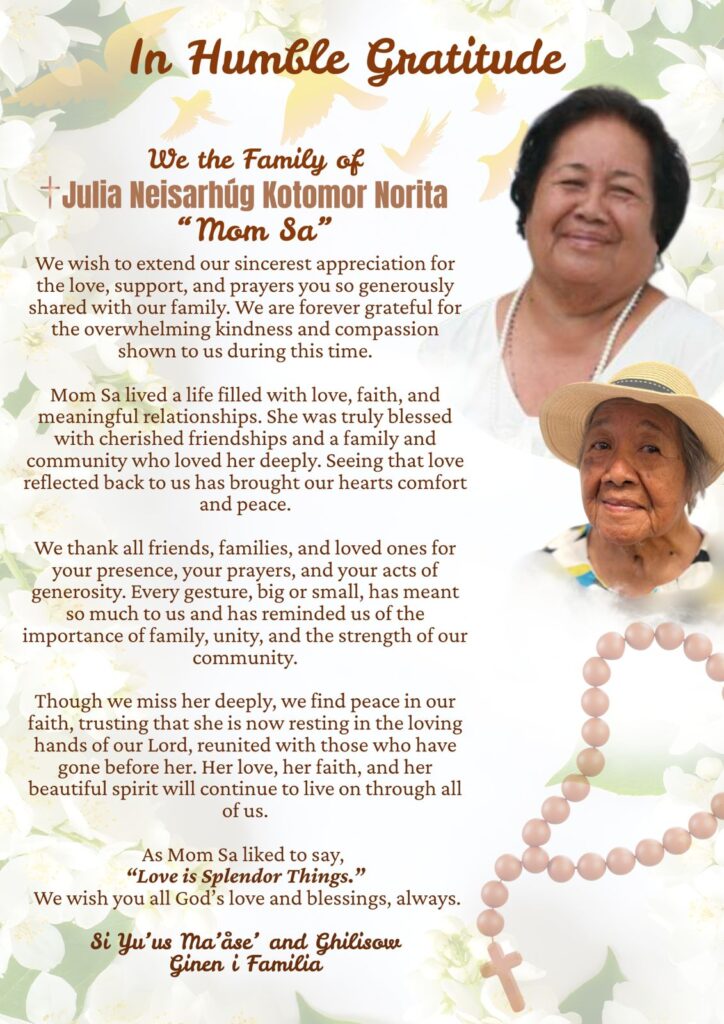 The family of the late Julia Neisarhúg Kotomor Norita, known lovingly to her family and community as “Mom Sa,” has extended their heartfelt thanks to all who offered love, support and prayers during their time of loss.