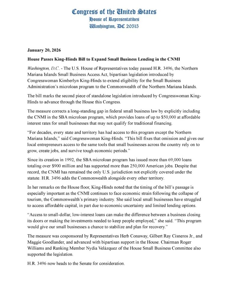In her statement, King-Hinds said the CNMI has been the only U.S. jurisdiction not explicitly covered under the program’s authorizing law. She said the change would help small businesses that can’t qualify for traditional financing by making available microloans of up to $50,000 at affordable interest rates.