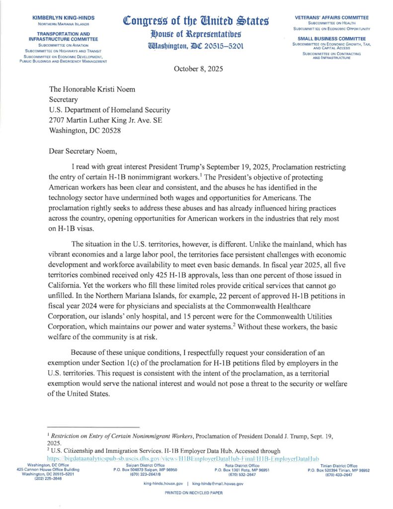 In a letter to Homeland Security Secretary Kristi Noem, King-Hinds said that while the President’s order targets abuses of the visa system that harm American workers, the situation in the Northern Mariana Islands and other territories is markedly different.