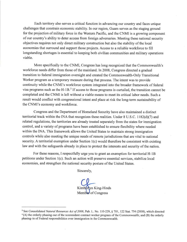 The congresswoman also linked the issue to national security, citing the CNMI’s role in supporting U.S. military readiness in the Western Pacific. She warned that limiting H-1B access would jeopardize the region’s stability and undermine congressional intent established under the Consolidated Natural Resources Act of 2008, which created the Commonwealth-Only Transitional Worker program to bridge the CNMI into the federal system.