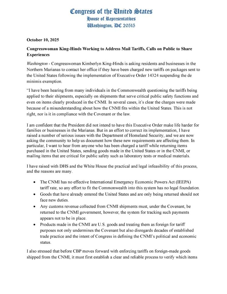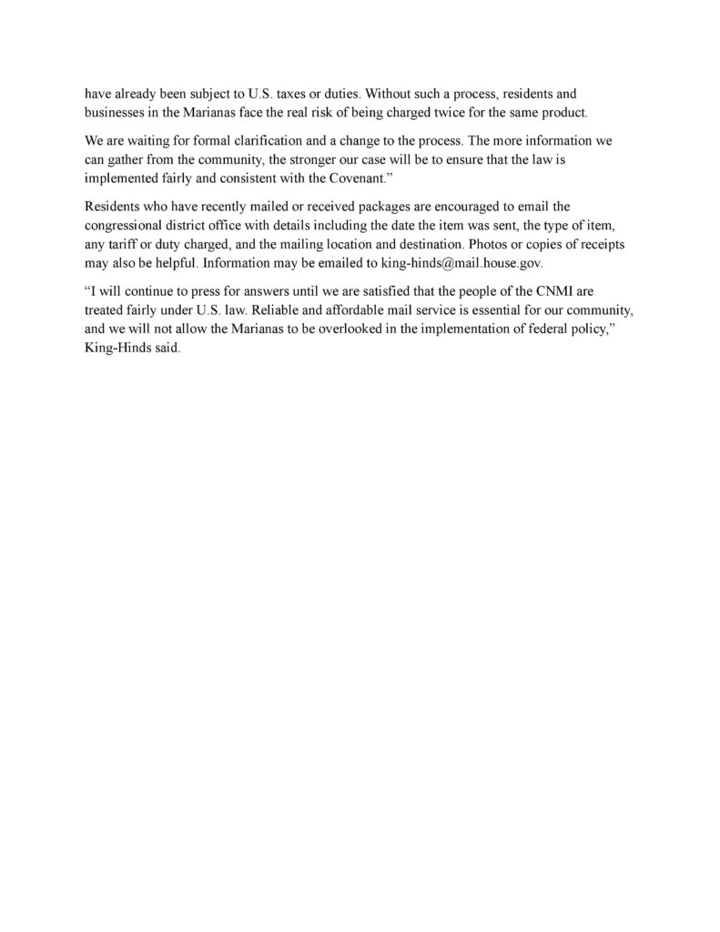 WASHINGTON, DC – Congresswoman Kimberlyn King-Hinds is urging residents and businesses in the Northern Marianas to report any new tariffs charged on packages mailed to the United States following the suspension of the de minimis exemption under Executive Order 14324.