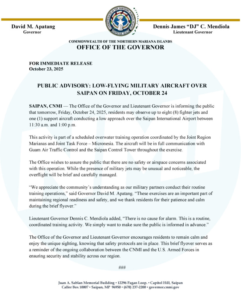 SAIPAN — Up to eight fighter jets and one support aircraft will conduct a low approach over Saipan International Airport on Friday, Oct. 24, 2025, between 11:30 a.m. and 1:00 p.m., according to the Office of the Governor and Lieutenant Governor. The flyover is part of a scheduled overwater training coordinated by Joint Region Marianas and Joint Task Force – Micronesia. Aircraft will remain in full communication with Guam Air Traffic Control and the Saipan Control Tower, and officials emphasized there are no safety or airspace concerns tied to the operation.