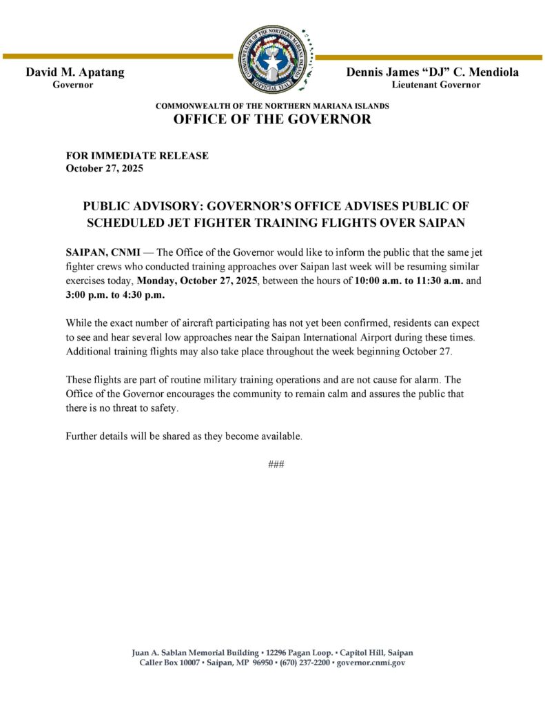 The exact number of aircraft has not been confirmed, but the Governor’s Office says residents can expect to see and hear several low approaches near the Saipan International Airport during those windows. Additional training flights may also take place throughout the week beginning Oct. 27.
