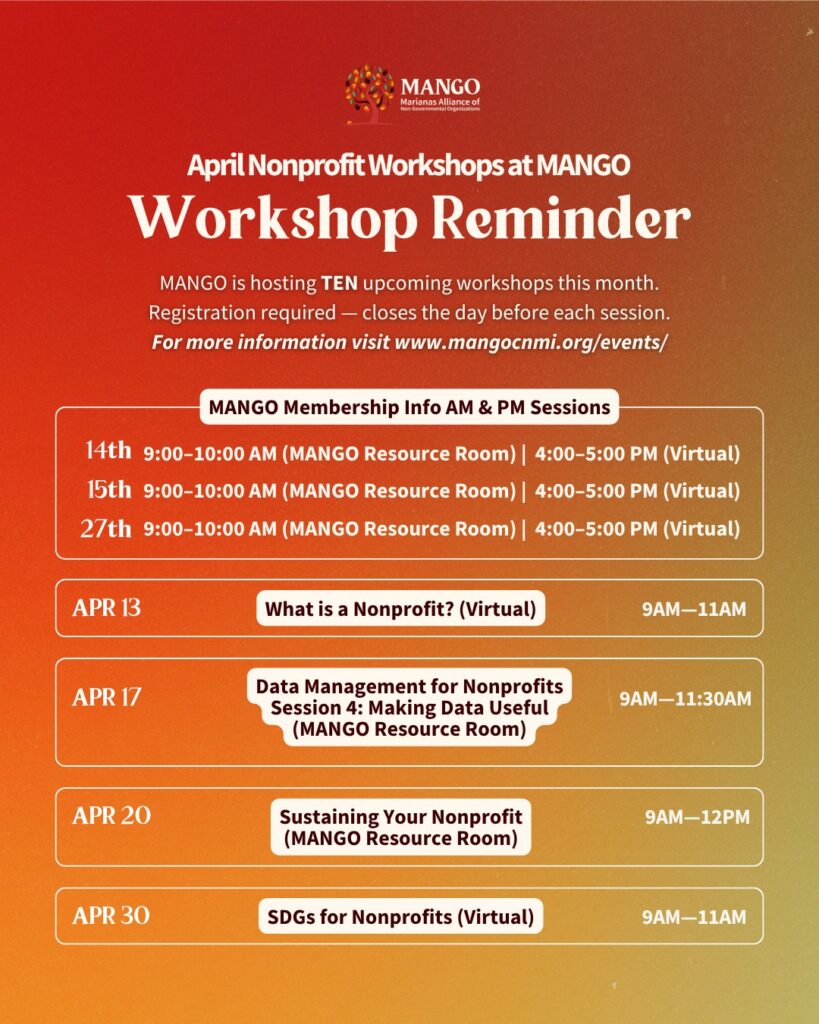 SAIPAN — The Marianas Alliance of Non-Governmental Organizations is offering a free series of nonprofit capacity-building workshops in April, open to nonprofit leaders, staff and community members across the Commonwealth.