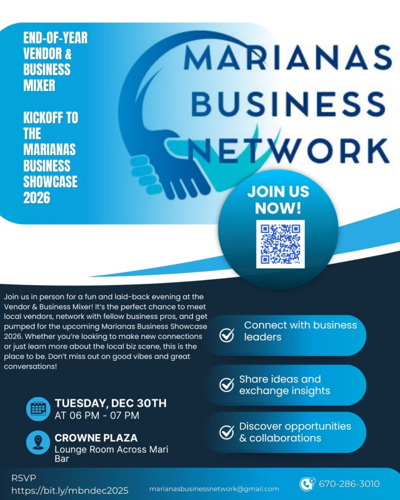 SAIPAN – The Marianas Business Network is hosting an end-of-year vendor and business mixer on Tuesday, December 30th, serving as the kickoff event for the upcoming Marianas Business Showcase 2026.