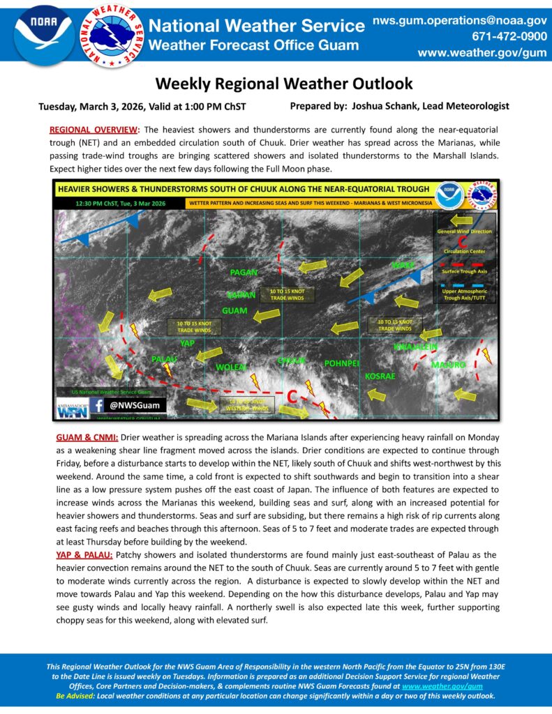 For Guam, conditions mirror those of the CNMI, with drier weather expected through Friday before the weekend pattern brings increased wind, seas, and rainfall potential.